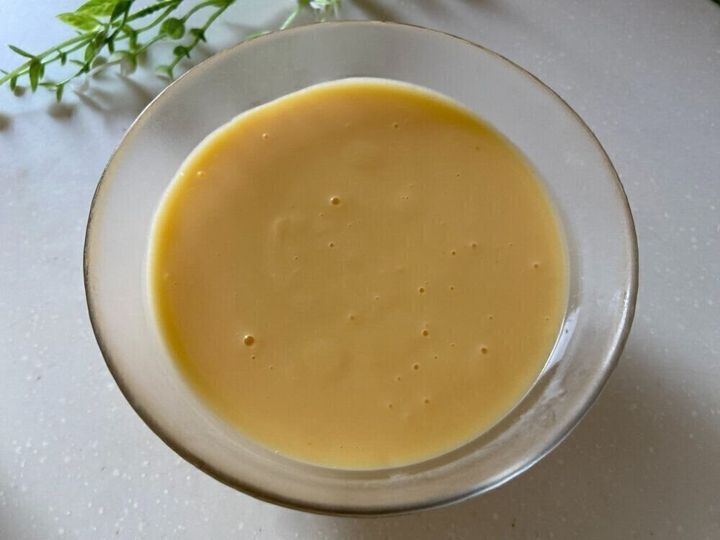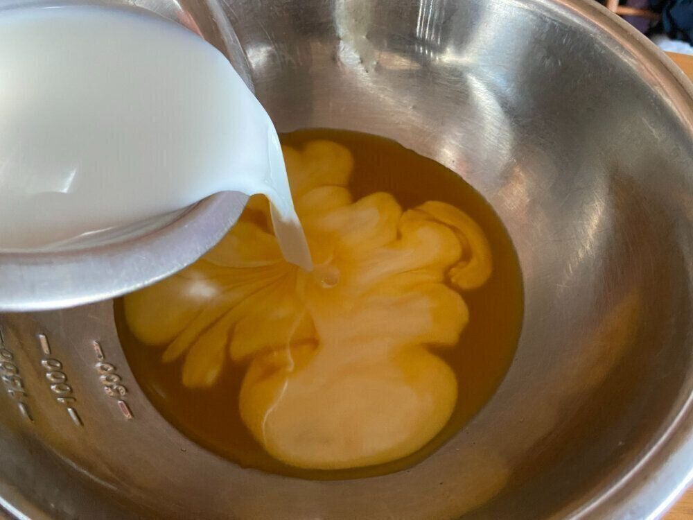 マンゴープリンの素を1袋、ボウルに開けて200mlの牛乳を注ぎます。マンゴープリンの素は常温で、牛乳は冷えていても冷えていなくてもどちらでも良いとのこと。