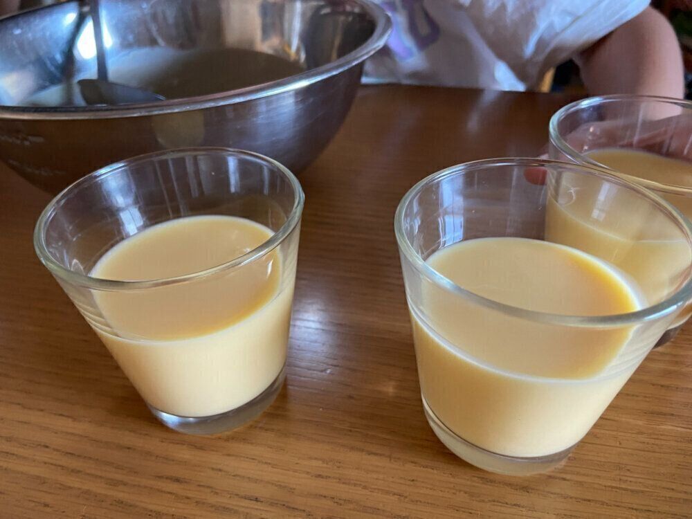 よく混ぜてとろみがついてきたら、お好みの型に流し入れます。牛乳と混ぜるだけ、という簡単な工程なので、3年生の次女が全部ひとりで進めています。
