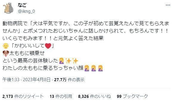 「犬は平気ですか、この子が初めて芸覚えたんで見てもらえませんか」という問いに対し、なごさんは「もちろんです!!いくらでも見ます!!」と喜んで答えます。