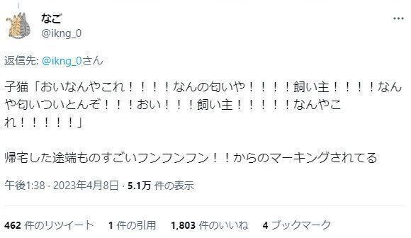 小判くんは「おいなんやこれ!!!!何の匂いや!!!!飼い主!!!!なんや匂いついとんぞ!!!!おい!!!!飼い主!!!!なんやこれ!!!!」とアテレコしたくなるほど、ものすごい勢いでフンフンフンとなごさんの匂いを確認。その後しっかりマーキングをされたなごさんでした。