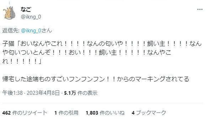 自宅では2匹の猫を飼っているなごさん。帰宅後、子猫の小判くんから嫉妬されたという投稿も拝見しました。どのような様子でしたか。