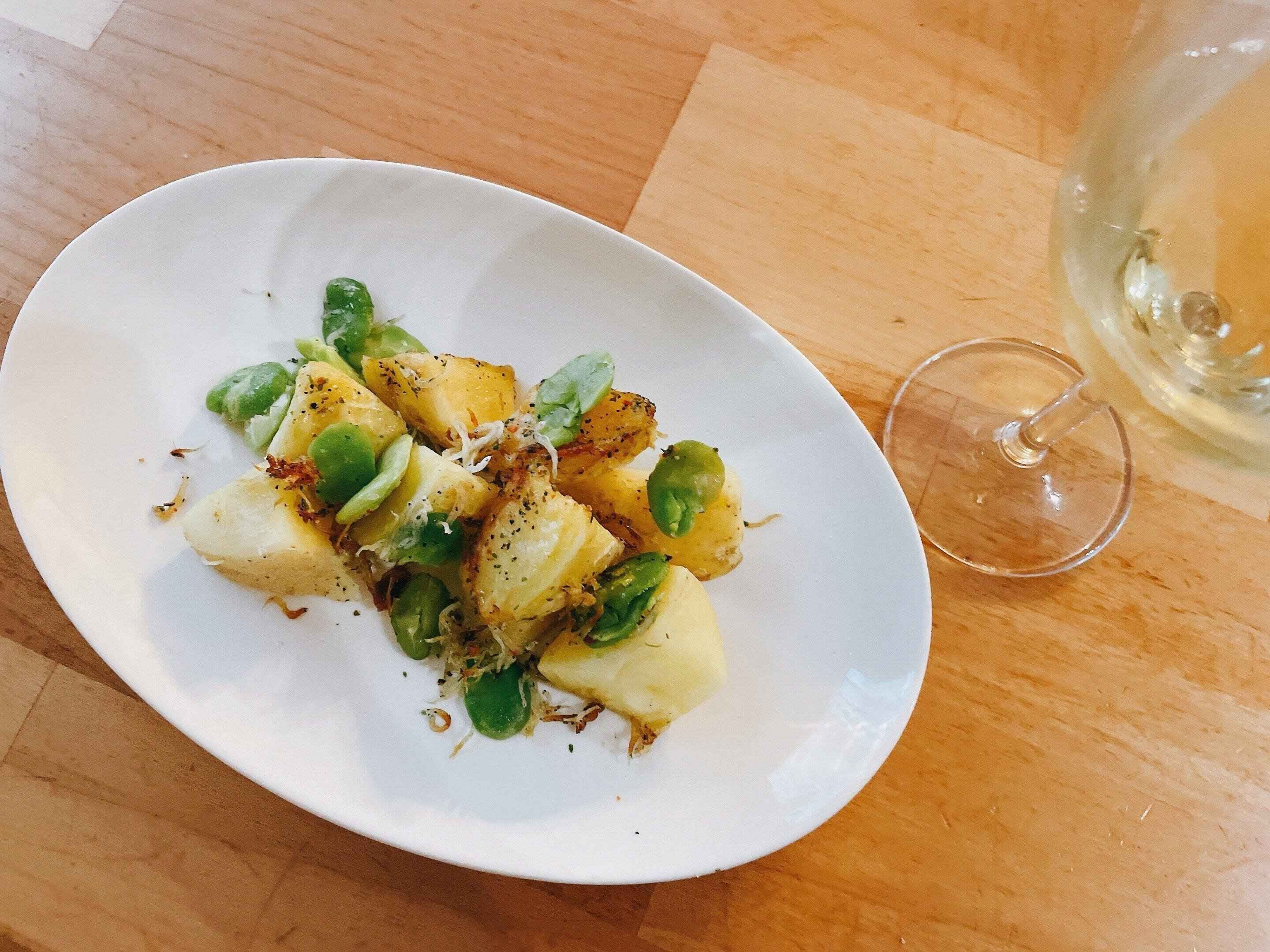 味付けはバジルなどのハーブ系なのですが、ホクホクのじゃがいもにたっぷりしらすが絡んでいて、そら豆がどこか和風に仕上げてくれています。