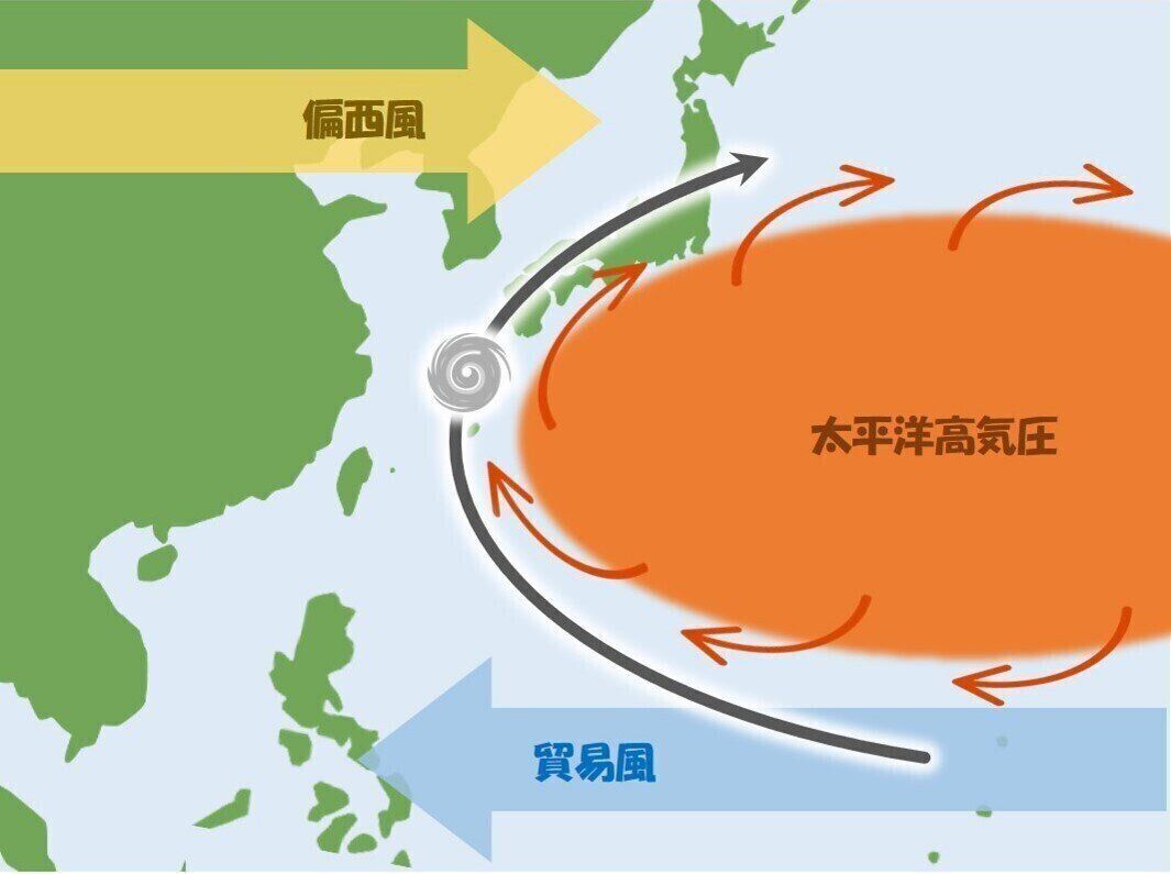 台風が発生しやすい熱帯の海では常に貿易風という東よりの風が吹いていて、発生直後しばらくその風に乗って動いていくと太平洋高気圧に近づくことになり、太平洋高気圧の周囲を吹いている時計回りの流れに乗ることになります。