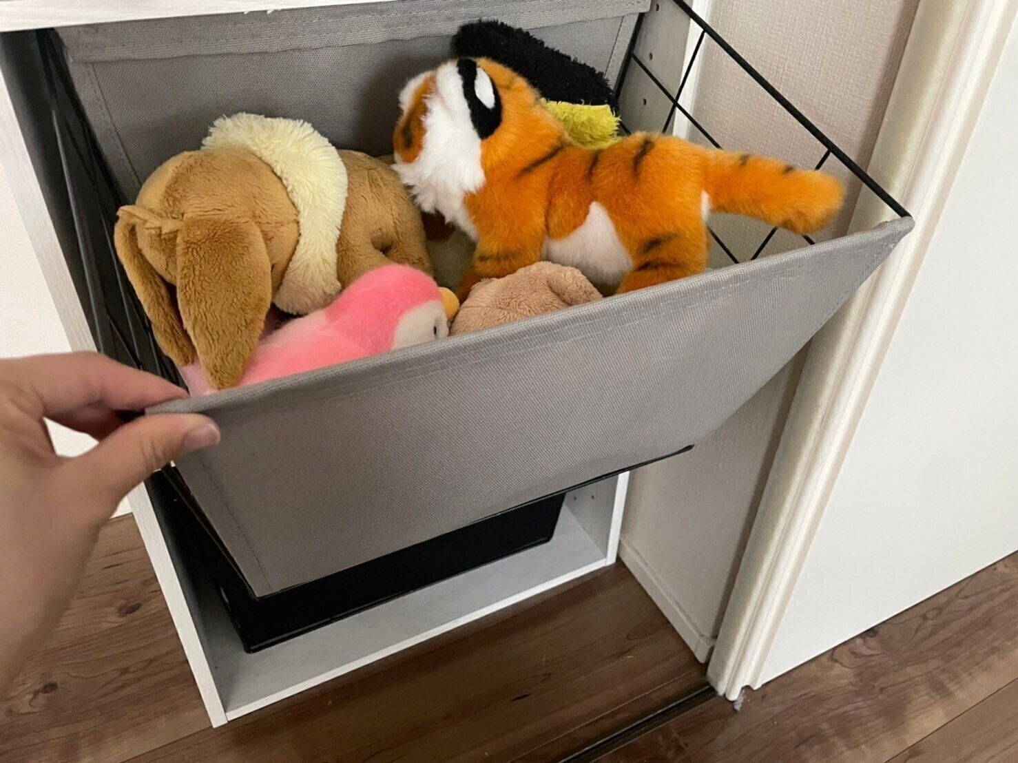 我が家では、子どものぬいぐるみ収納に使用しています。見た目がごちゃごちゃしてしまうぬいぐるみのカラフルさを隠しつつ、子どもが遊ぶリビングに置くことができて、親子ともにうれしい効果です。