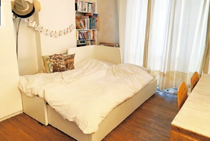 日中はベッドをソファにして空間を有効利用。大きな窓が開放感を演出して、部屋を広々と見せてくれます。ソファ脇には夫婦のクローゼットと、とのさんの仕事コーナーが。