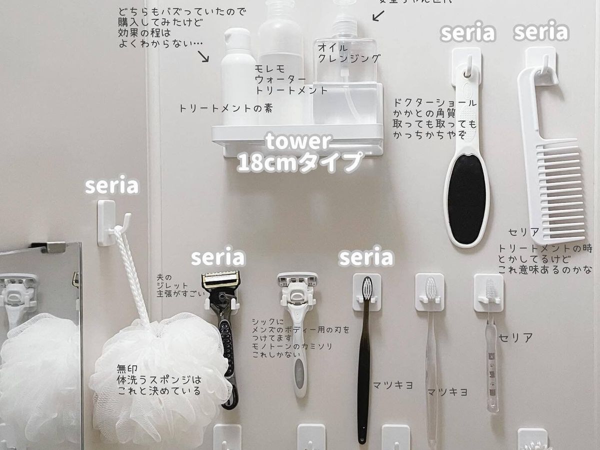 バスルームに置く小物は、少しでも衛生に保管しておきたいですよね。そこでおすすめなのが浮かす収納。自然と水切りができるため、衛生的に保管が可能です。セリアには、さまざまな浮かす収納アイテムがそろっています。歯ブラシフックやカミソリフックなど、アイテムに合ったものが展開されているため、収納のしやすさも抜群。もちろん洗面所でも活躍しますよ。