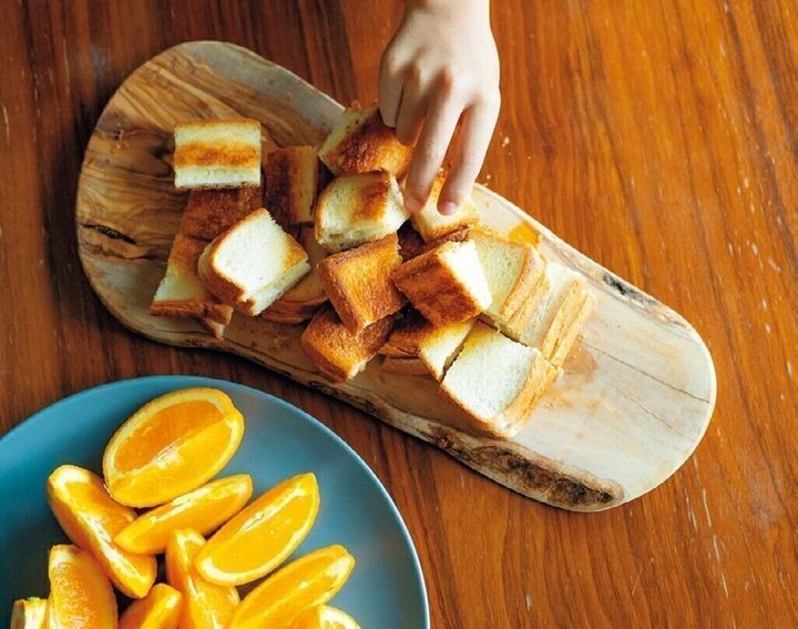 「パンをまな板の上で切って、そのまま出す。まな板がおしゃれでよかったわ~。朝ごはんが一瞬でなくなる、男子の食欲が怖い」。