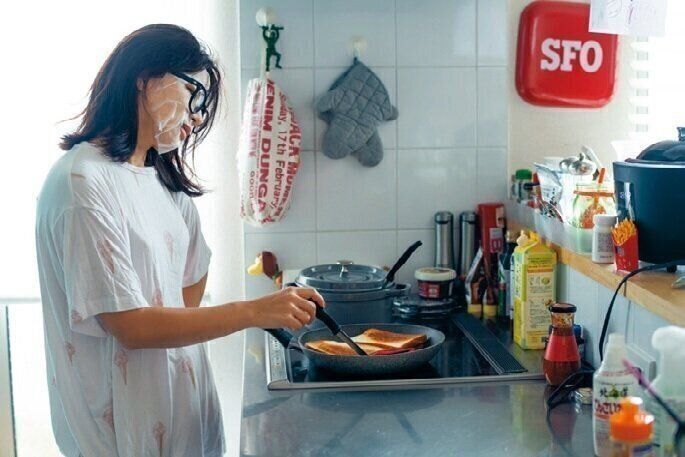 シートマスクをしながら朝ごはん作り。ママの朝はマルチタスクよ、マルチタスク!