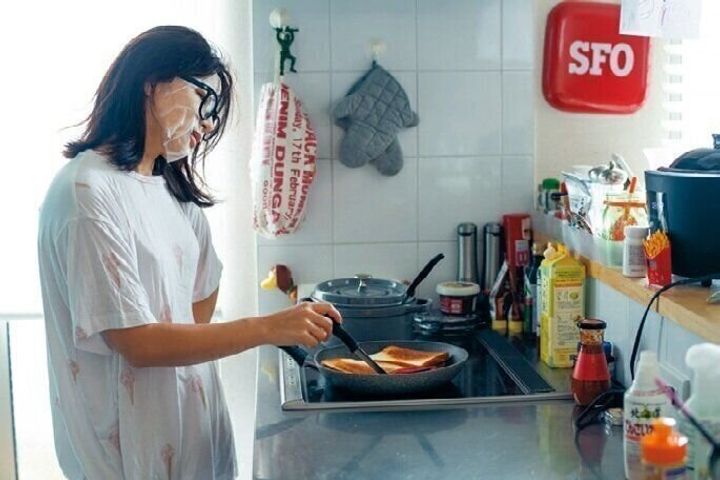 - シートマスクをしながら朝ごはん作り。ママの朝はマルチタスクよ、マルチタスク!