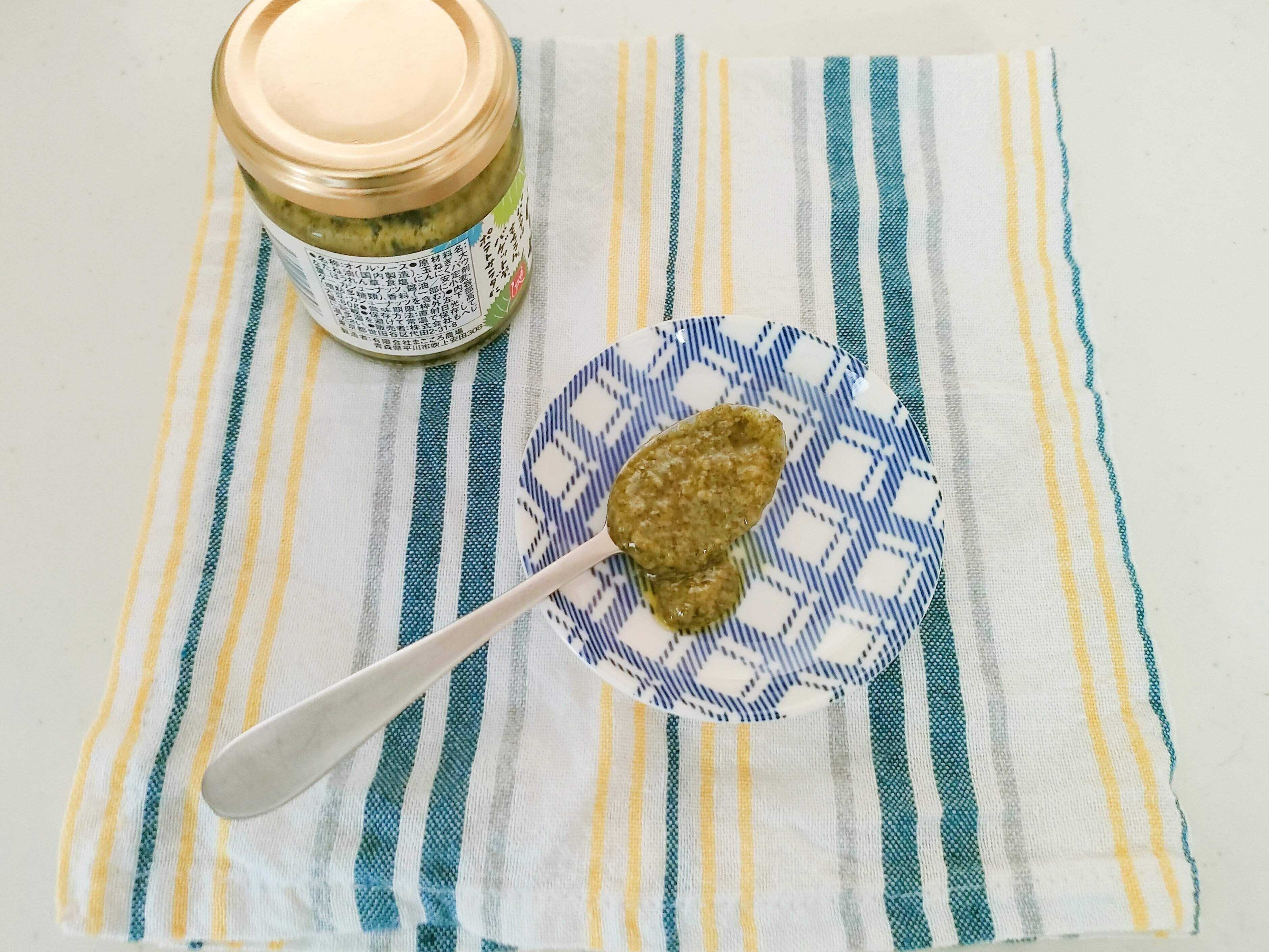 味は塩分強めに仕上がっています。このまま食べるのではなく、パスタやパンにつけて食べると良さそう。パッケージにもバゲットやポテトサラダに合うと書かれています。