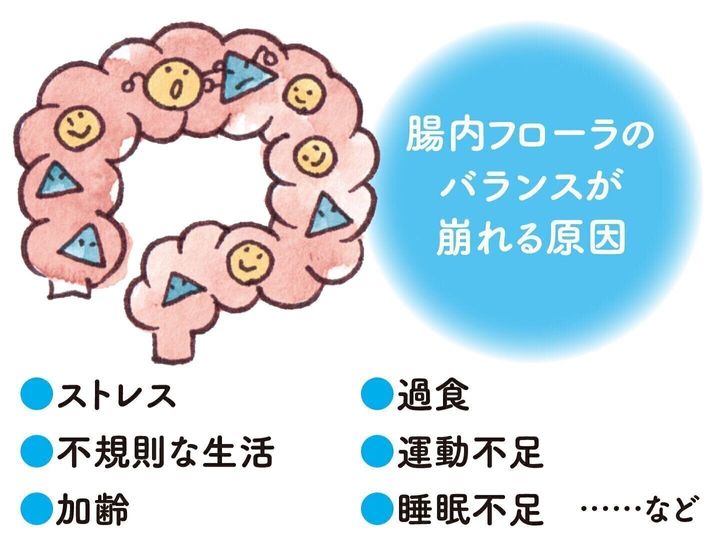 腸内に生息している多種多様な細菌の集合体のこと。腸内には善玉菌、悪玉菌などさまざまな菌がバランスを取って存在しています。乳酸菌やビフィズス菌は善玉菌の代表格なんです。腸内フローラはおなかの調子、肌荒れ、太りやすさなどと関係していて、腸内フローラを善玉菌優位で健康な状態に保つことが、全身の健康にもつながると考えられています
