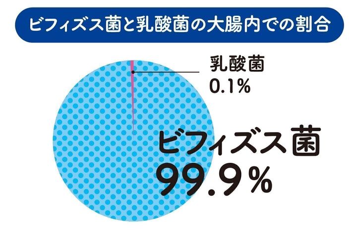 働く場所の違いの一つは酸素があるかないか。乳酸菌は酸素があっても活動でき、酸素が届く小腸で主に働きます。ビフィズス菌は酸素に弱いため、酸素がほぼない大腸で主に働きます。実は、大腸でのビフィズス菌と乳酸菌(*)の比率は99.9%:0.1%。大腸では圧倒的にビフィズス菌が多いんです