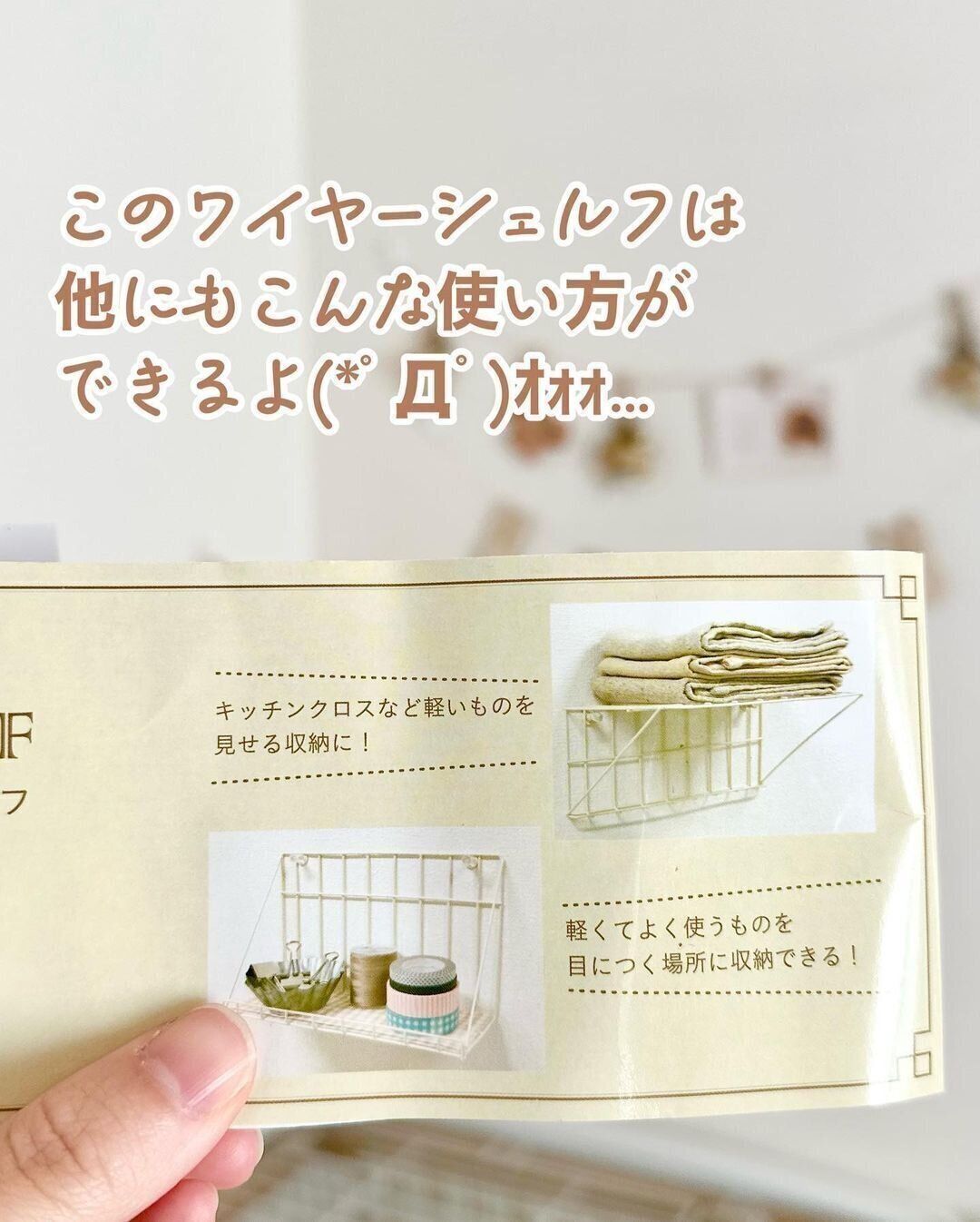 ほんのりベージュカラーがかわいい「ツーウェイワイヤーシェルフ」。ピン2本で簡単に取りつけ可能です。あまり重いものは載せられませんが、軽いものを見せながら収納することができます。