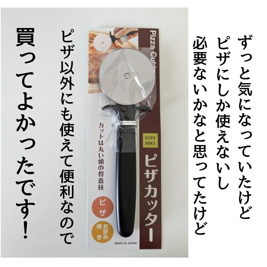 あると意外と使えるのが「ピザカッター」。ピザ以外にも、お好み焼きやチヂミ、ガレットなどなど、いろんなものに使えて便利なんです。セリアなら日本製のピザカッターが110円で買えちゃいます!