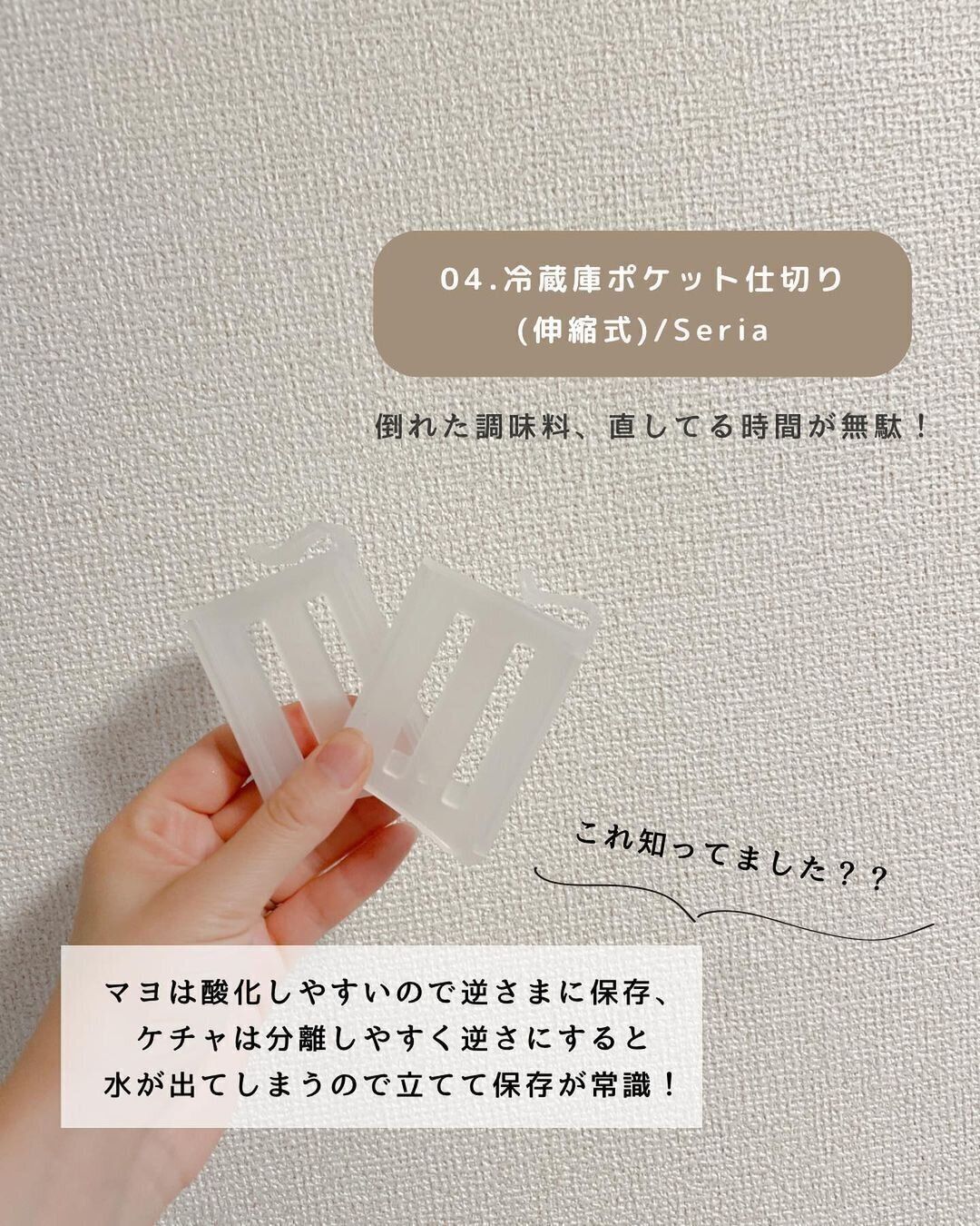 冷蔵庫の中はこまかいものも多く、ぐちゃぐちゃになりやすい場所の一つ。開けっぱなしにすると冷気が逃げてしまうし、探すのに時間はかけたくないですよね。セリアで買えるこちらの「冷蔵庫ポケット仕切り」を使えば、マヨネーズやケチャップなど倒れやすいものがすっきり収納できます。