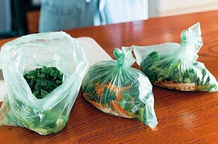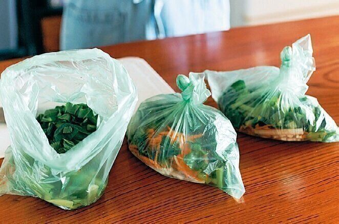野菜はまとめてカットして1回分ずつに分けて保存。みそ汁、ラーメン、炒め物の具に重宝。「カットしておけば夫でも作れます」。