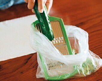 ポリ袋の中でスライサーを使ってきゅうりをせん切りに。もずくスープの素を加えて袋をモミモミ。まな板やボウルを洗う手間と時間をカット☆