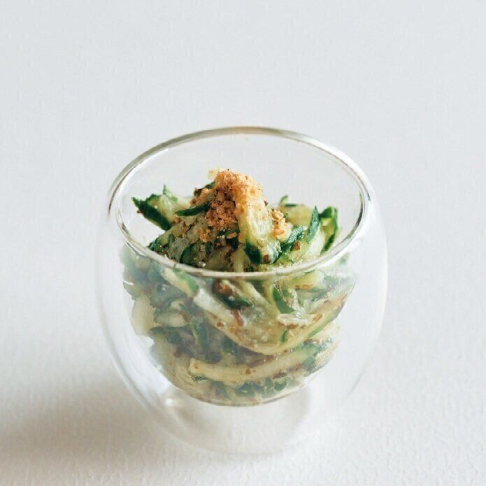 ポリ袋にせん切りきゅうりとフリーズドライのスープの素をIN。きゅうりの水分でスープの素が溶けます。味つけ不要でラク。