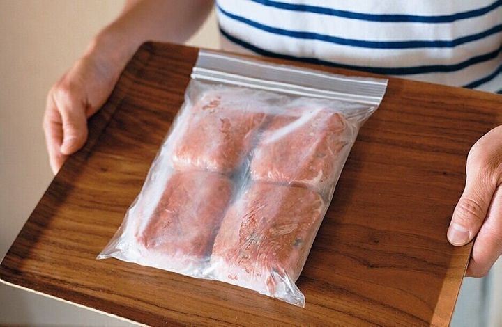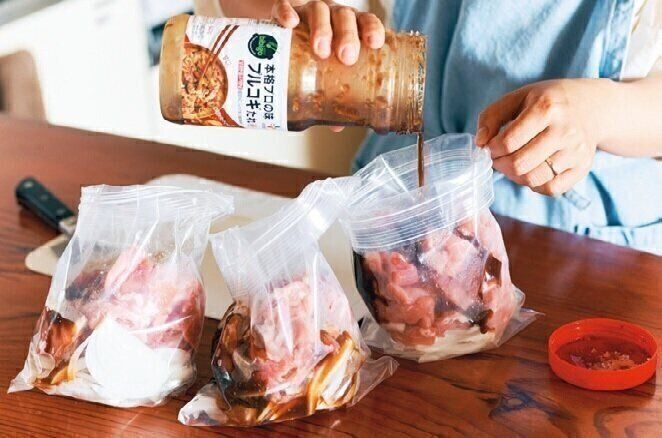 1kgの豚こま肉で3回分のプルコギをいっぺんに作ります。「1つはその日の夕飯、2つは冷凍。冷凍すると味がしみ込んでおいしくなります」。
