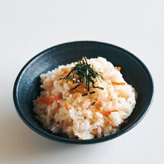 米2合、切り干し大根10g(水で戻さない)を2合分の水で炊く。炊飯後、五目ちらしの素を混ぜる。