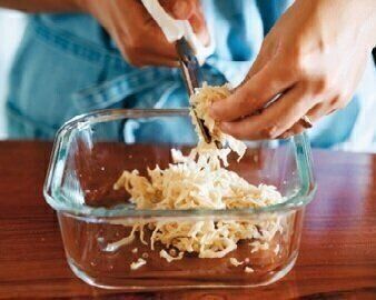ボウルを使わずに、保存容器に材料を直接入れて調理。ガラス製なら見た目がいいから、このまま食卓に出しても〇。残ったらフタをして冷蔵庫へ。