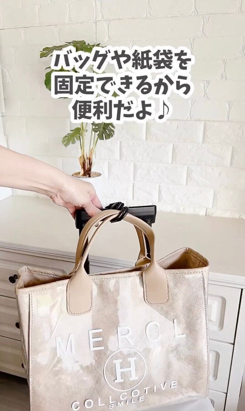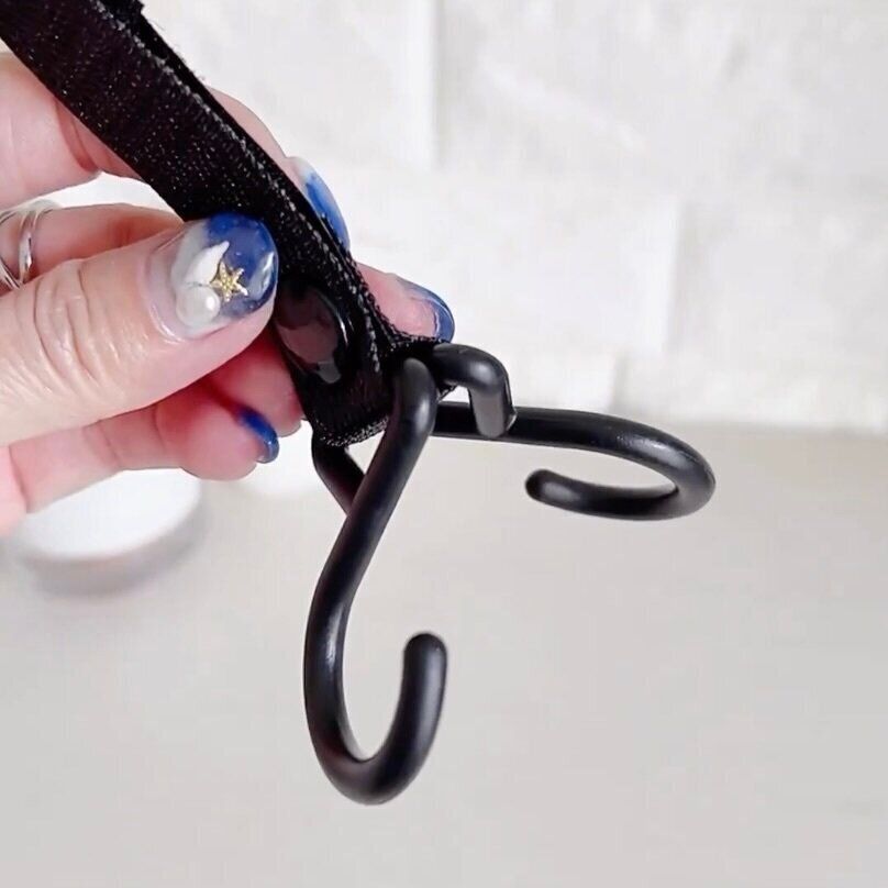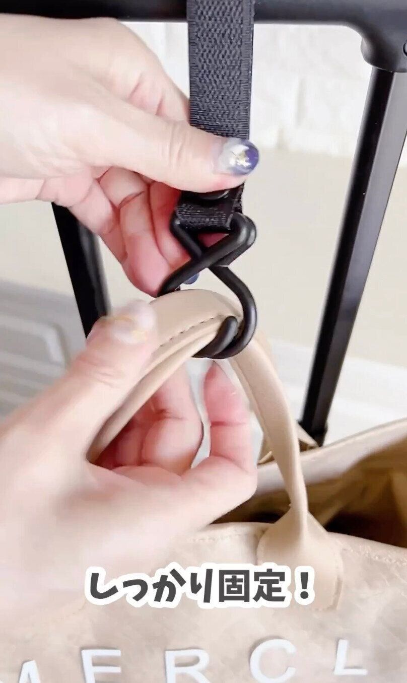 面ファスナーでベルト部分をスーツケースの持ち手に固定したあと、ダブルフックでバッグの持ち手をしっかりと固定します。両側から挟む構造で、外れにくくなっています。