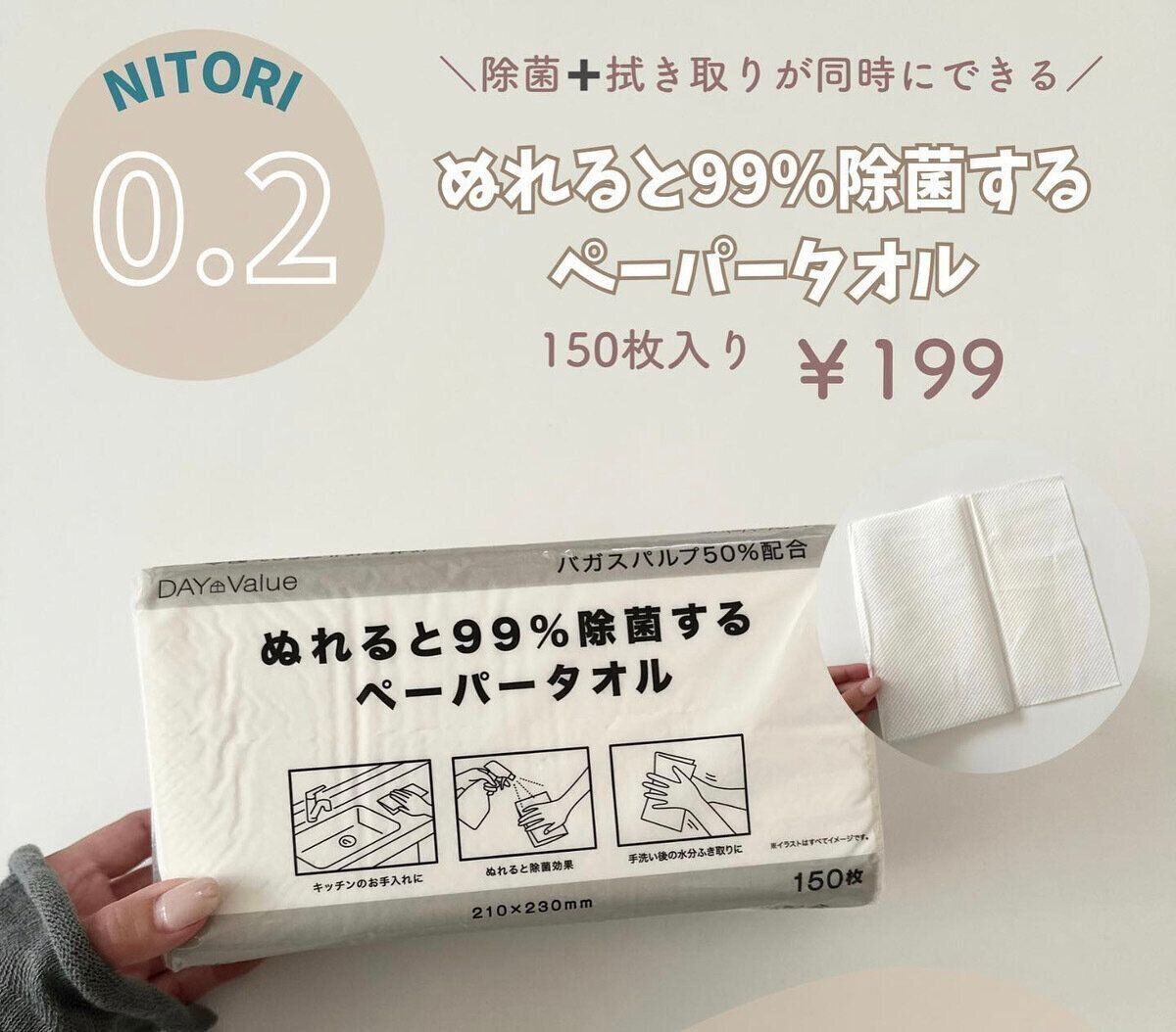 「ぬれると99%除菌するペーパータオル」は、ふきとりと除菌が1度にできるアイテムです。ペーパータオル自体に除菌剤が塗布されているという仕組み。キッチンやシンクなど、サッとふきとるだけで除菌もできるのはうれしいですね。お値段は、150枚入りで199円という驚き価格!これひとつ買っておくと、安心して使えるアイテムです。