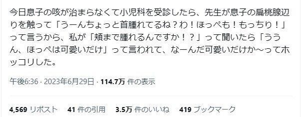 小児科を受診中、息子のほっぺをさわった先生の一言に「ホッコリ」「素敵」の声集まる