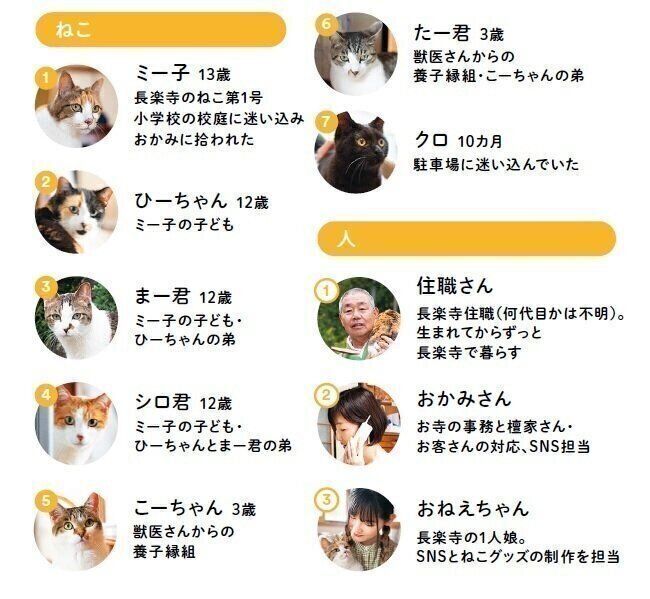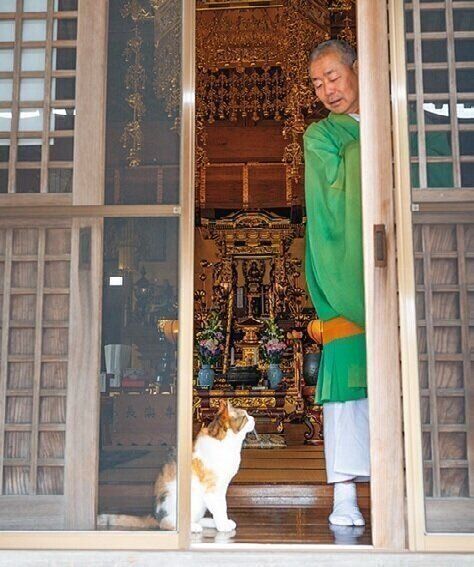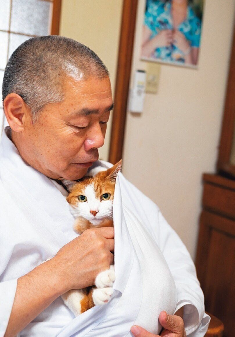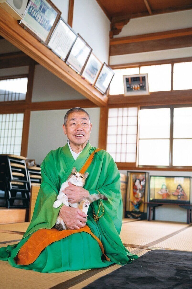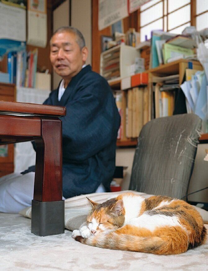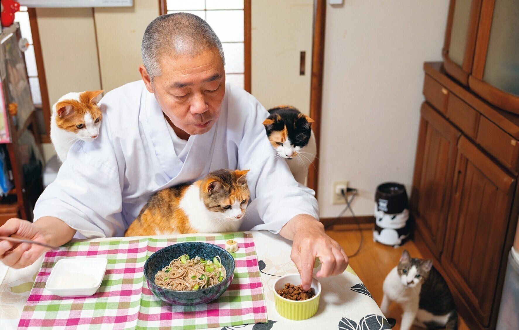 ねこ全部のせ。7匹のねこに囲まれる住職さんの食事風景はそう呼ばれSNSで大人気に。ですが、もともとこんなにねこを飼うつもりはなかったそうです。「最初はミー子がおかみさんの肩にしがみついてやってきて。東日本大震災で避妊手術が遅れていたら子ねこが産まれちゃってね。半分譲って、残り3匹はうちで飼うことにしました。その後、獣医さんに頼まれて2匹来て。最後は寺に迷い込んだ子ねこを保護して、気づけば7匹です」(住職さん)。
