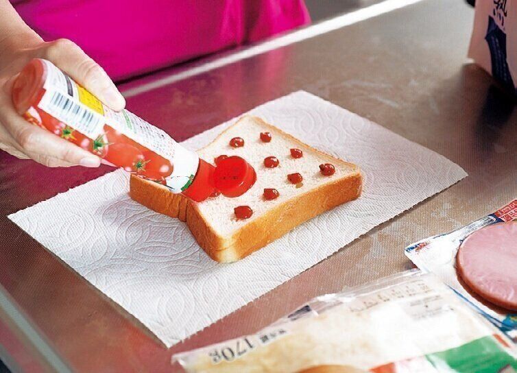 ピザトーストを作るとき、ピザソースを「塗ろう」とすると塗るスプーンなどが必要になり、洗い物が増える!そこでソース類はチューブからそのまま「点でのせる」ことに。その上にハムとチーズをのせて焼けば、問題なし。