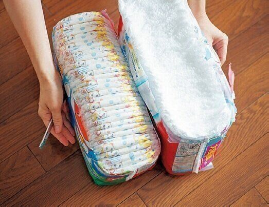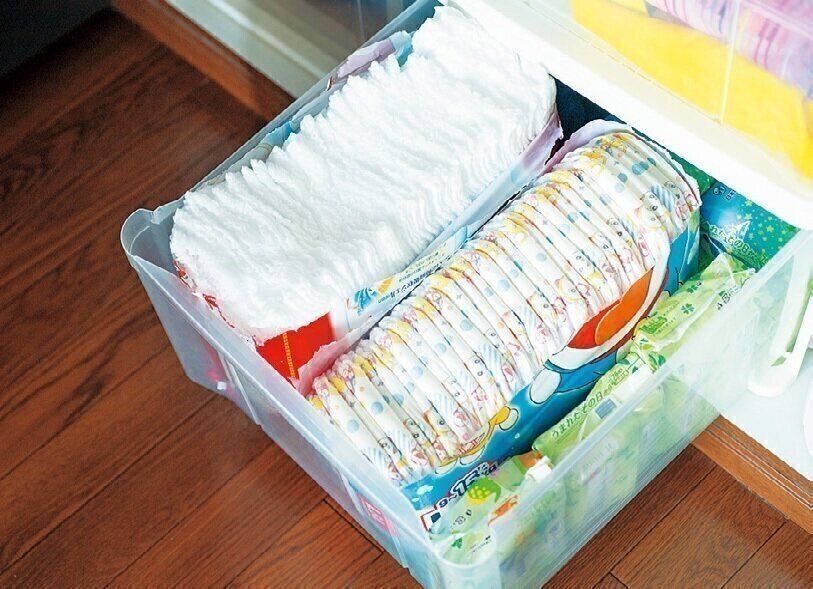 「オムツや掃除グッズは元々ぴったりのパッケージに入っているから、わざわざ別の収納グッズに移し替えたりしません。そのままでOK」。パッケージが目立ちすぎるなら、死角に配置して隠せばよし!