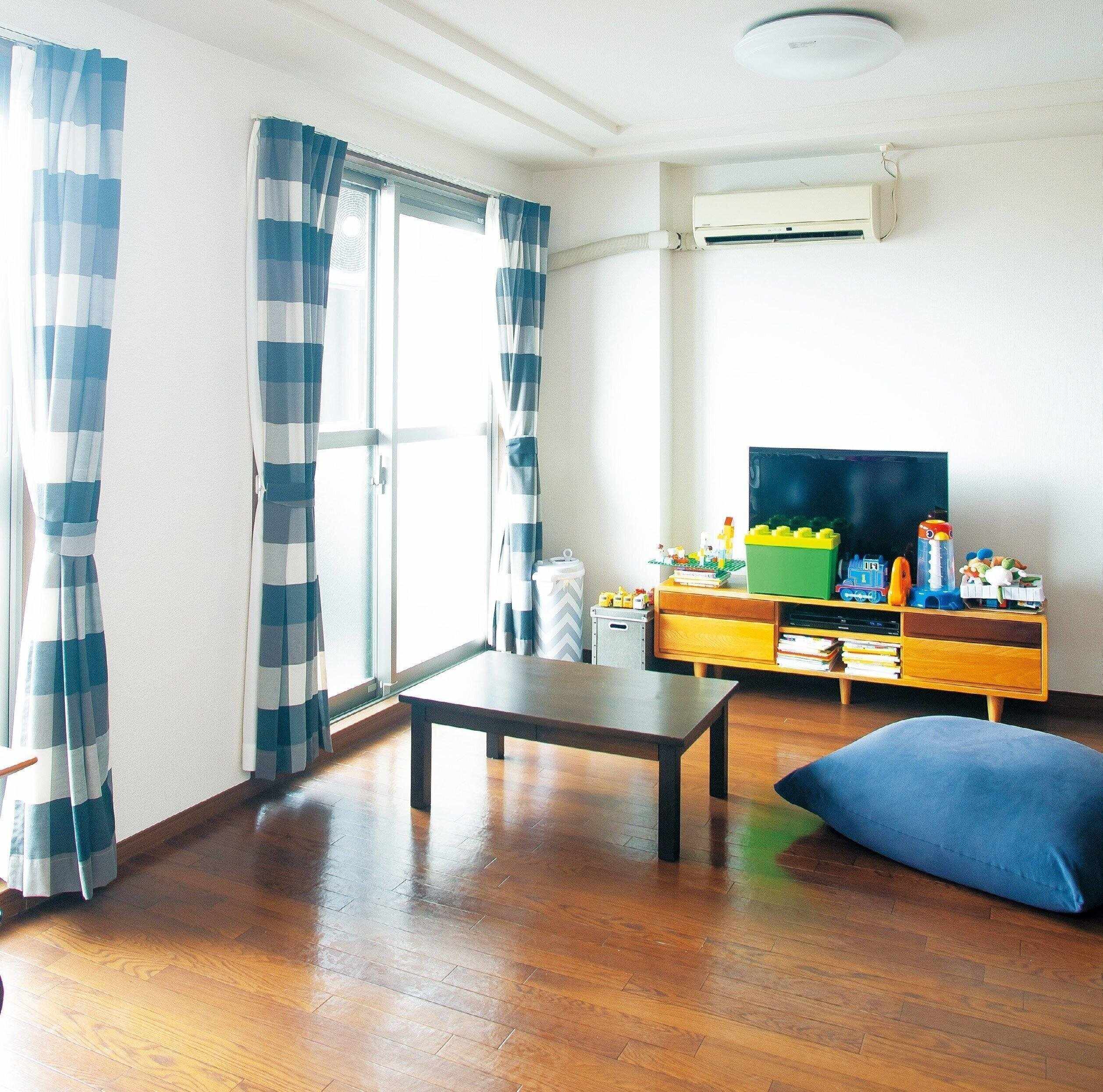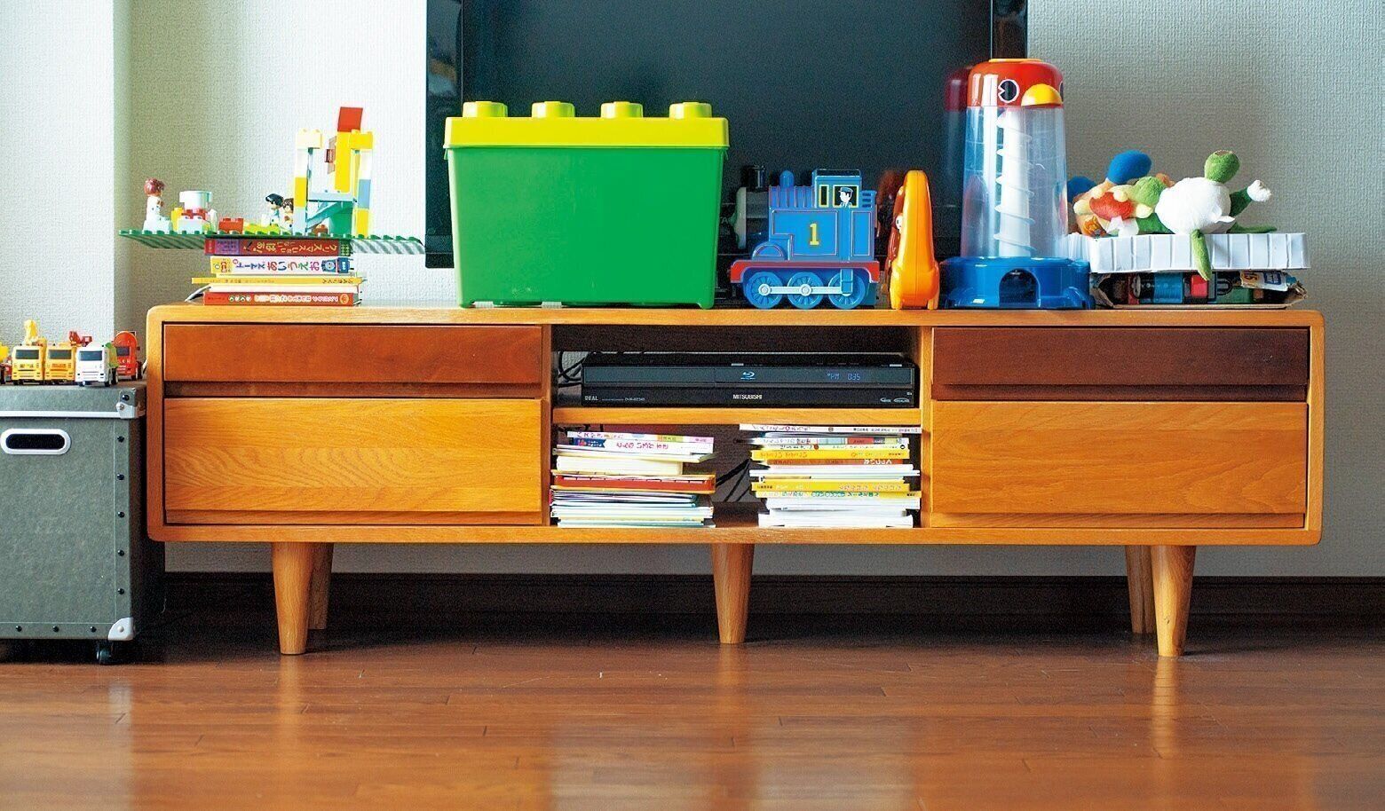 子どもはおもちゃを床に盛大に広げる生き物……。だから、「片づけがラク」な物だけに間引いて並べ、残りはしまっているおかさん。「ただテレビ台の上に並べるだけで、種類別に箱にしまったりもしません」。