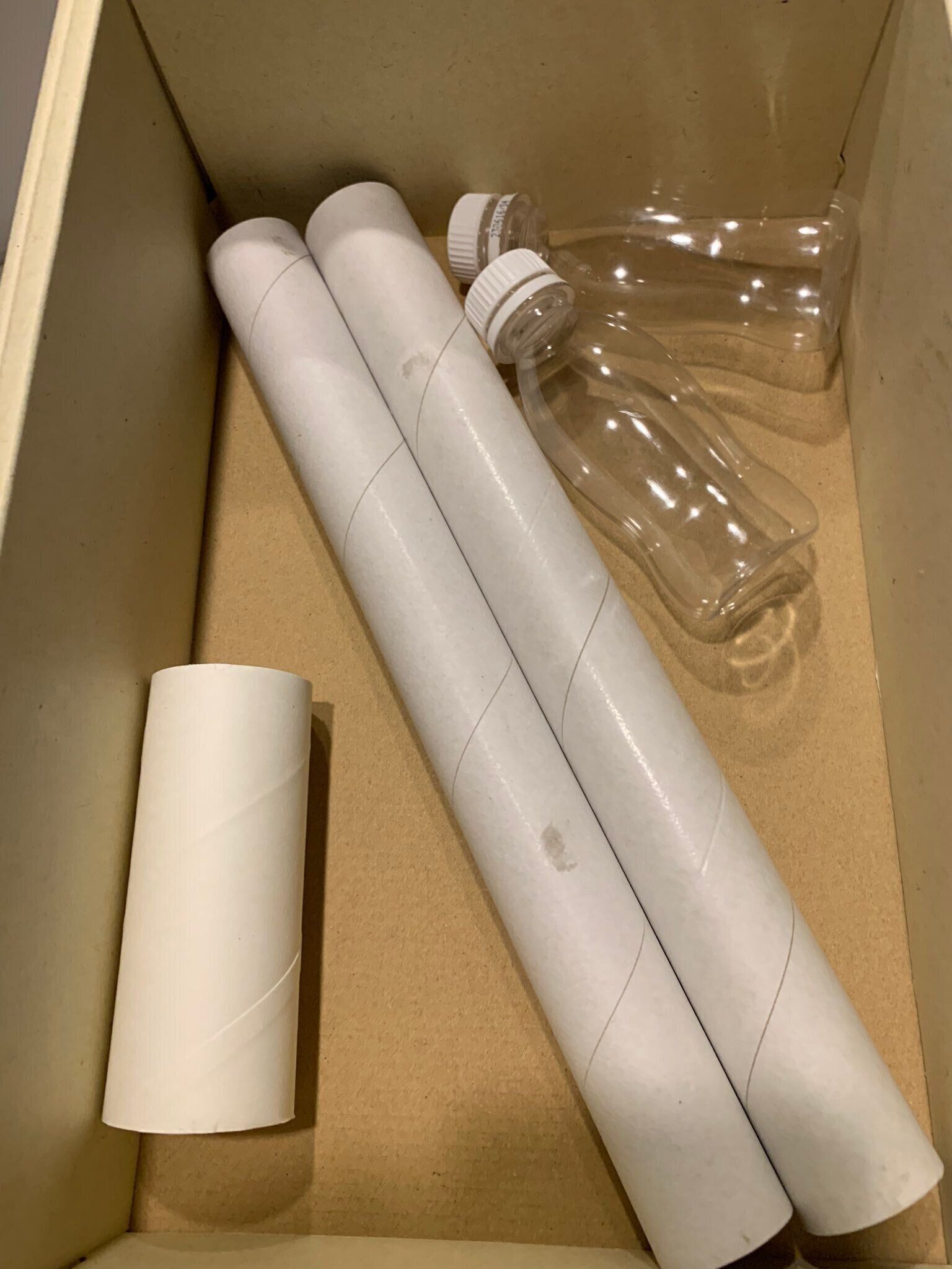写っていたのは、ダンボール箱に収められたトイレットペーパーやラップの芯。ヨーグルトの空き容器も入っています。
