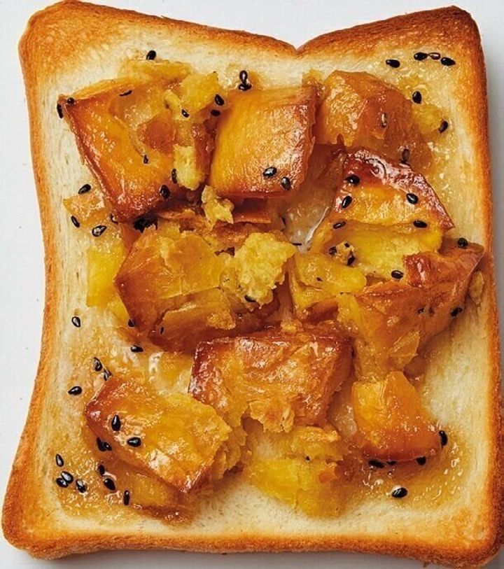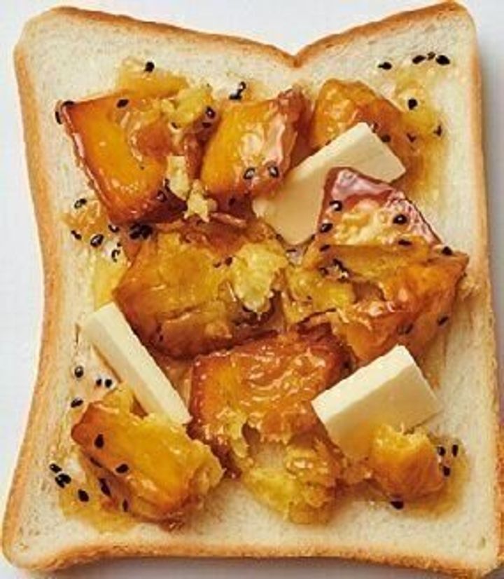大学いもをフォークで軽くつぶし、みつと一緒にパンにのせて、バターを散らす。