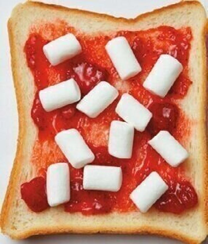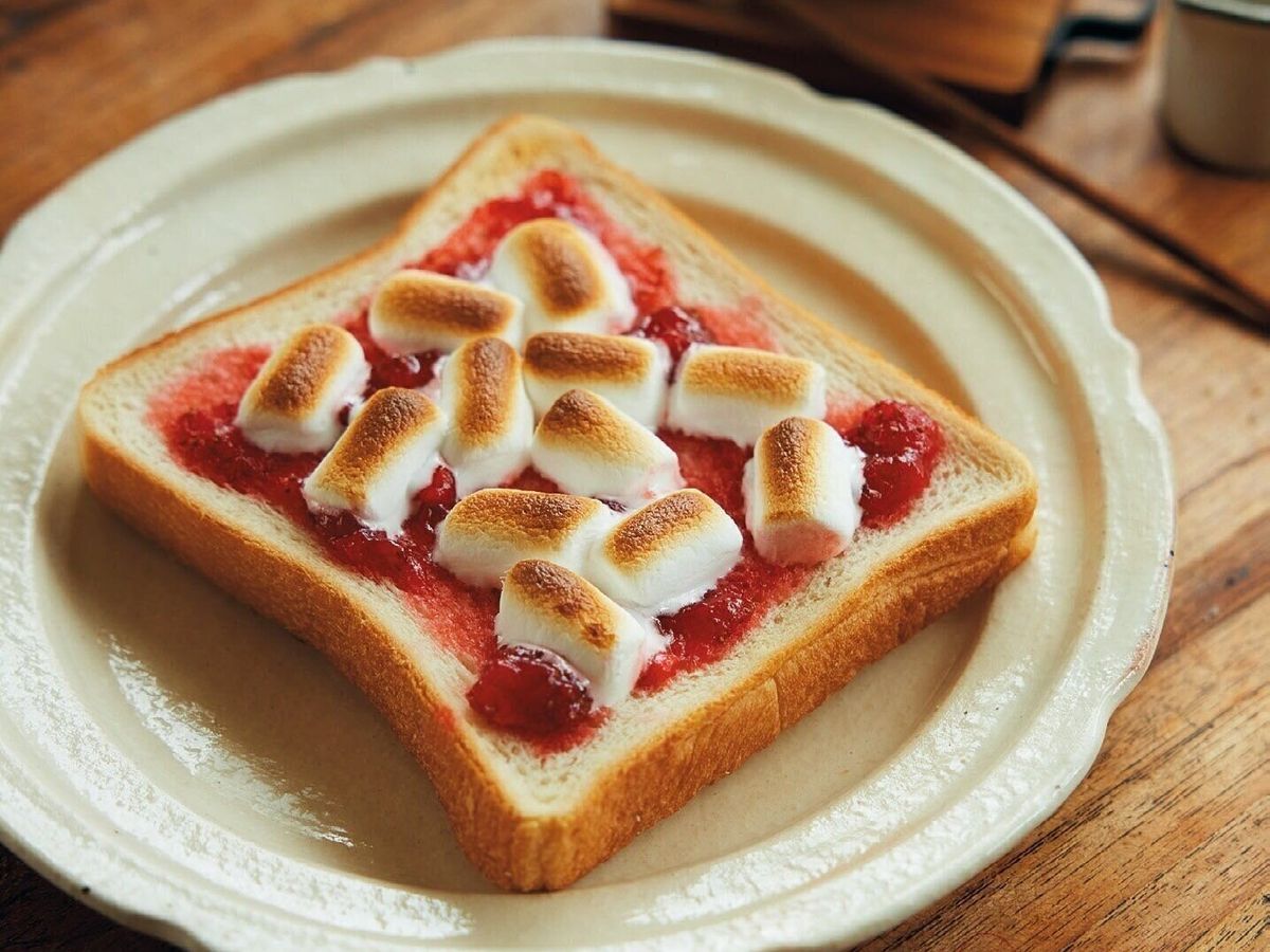 マーガリン、いちごジャムの順にパンに塗り、マシュマロを散らす。