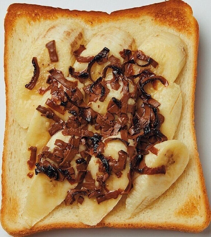 はちみつをパンに塗り、バナナを並べ、チョコを散らす。