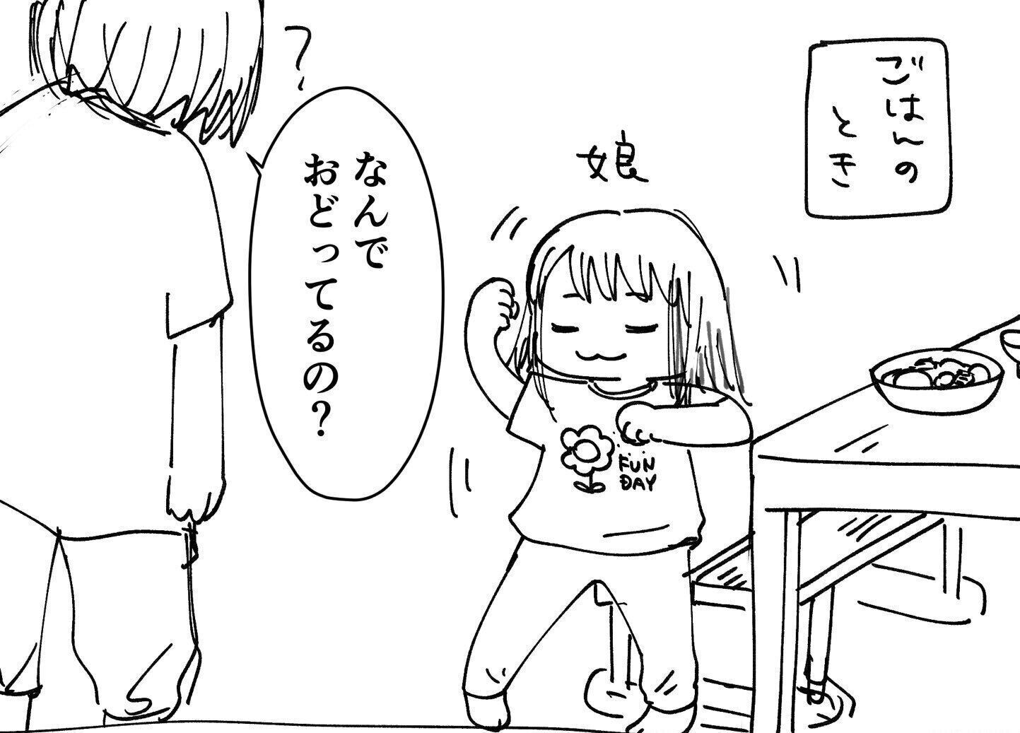 もぐさん(@Mog_ikg)が小学1年生の娘さんとのかわいらしいやり取りを描いた漫画をX(Twitter)に投稿しました。ごはんのときに踊り出した娘さん。その理由に癒やされる人が続出し、6万件以上のいいねを集めています。お話をうかがいました。