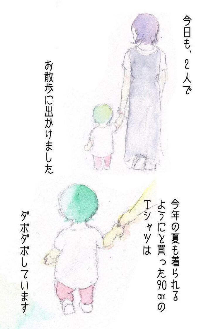 「今日も、2人でお散歩に出かけました 今年の夏も着られるようにと買った90cmのTシャツはダボダボしています」