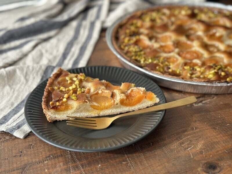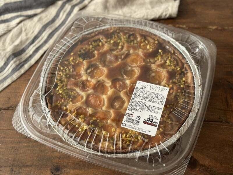 コストコに登場した新商品のタルト「アプリコット&ピスタチオタルト」は直径30cm以上あるBIGサイズで、迫力満点!たっぷりのアプリコットと、クラッシュしたピスタチオがトッピングされ焼き上げられた一品です。