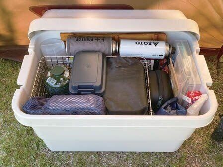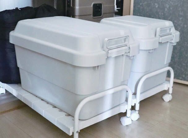 松永さんはキャンプグッズや食品を入れて、寝室に保管。キャスターに乗せれば、出し入れスムーズ。