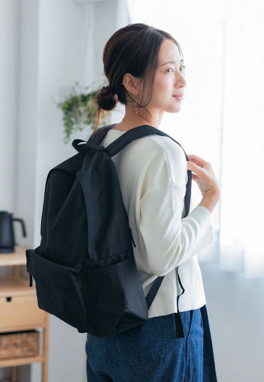 防災バッグには、両手が空くリュックがベスト。シンプルかつ大容量で、背負いやすい物を選んで。