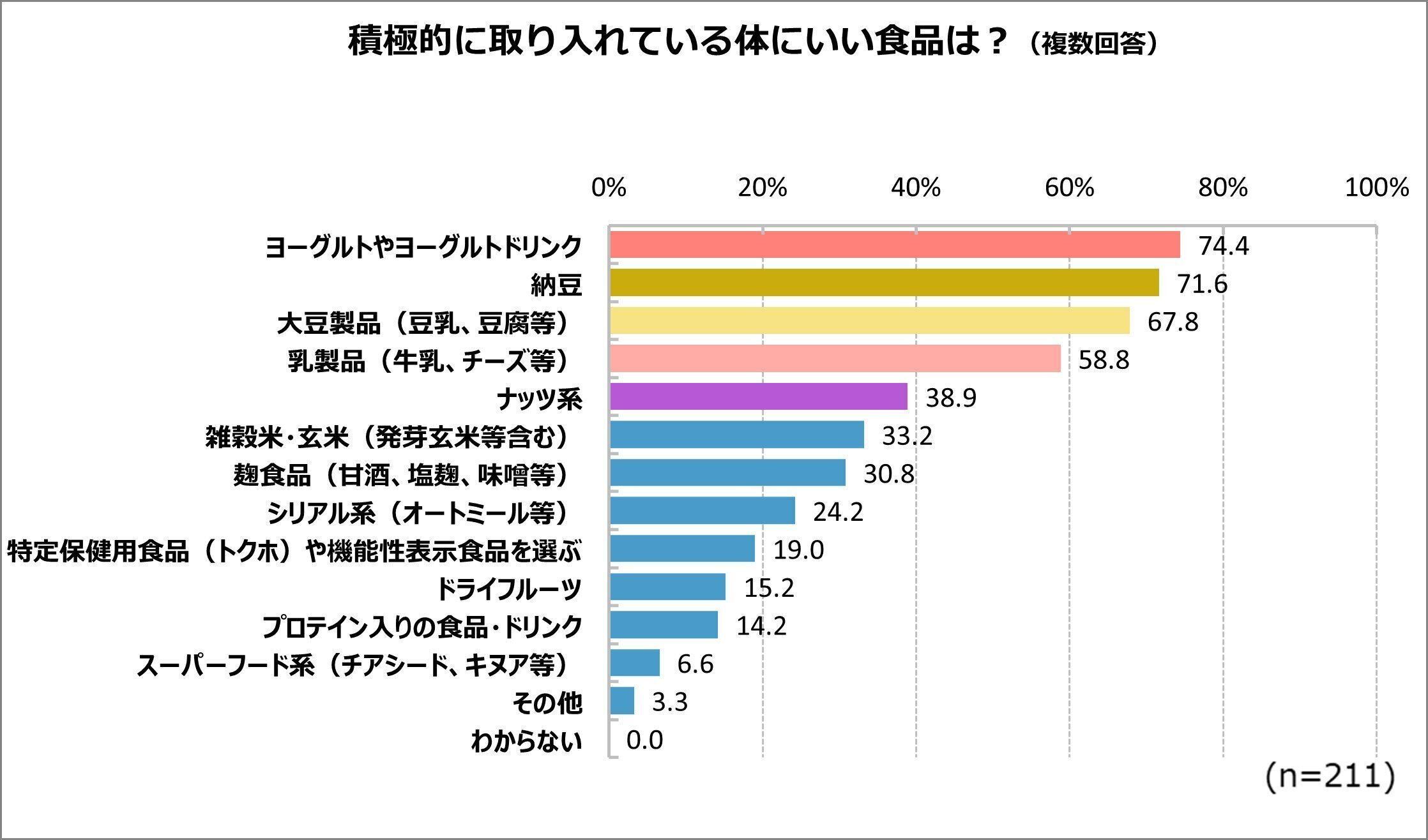 健康のためにしていることは「体にいい食品」選びと「デンタルケア」。意識して食べている食品は「ヨーグルト」と「納豆」。