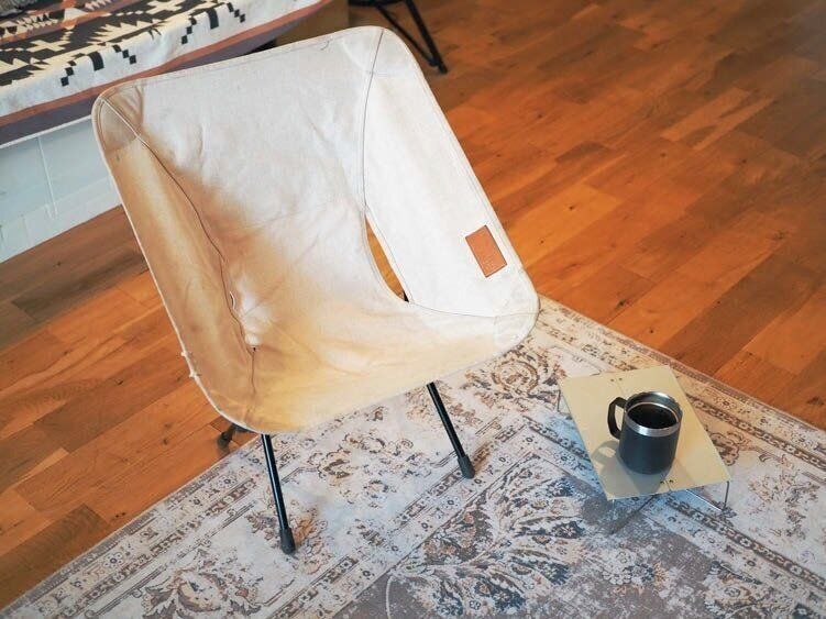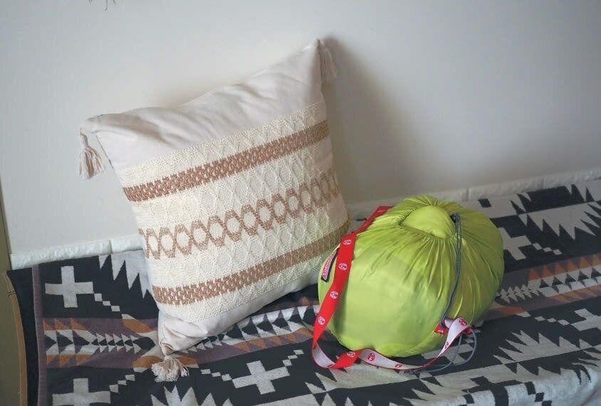 あると安心なものの、収納に困る寝袋。「インテリアになじむよう、わが家ではお気に入りのクッションカバーに入れています。キャンプのときもそのまま持って行って、車内でも使用。枕がわりにもなります」。