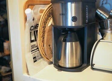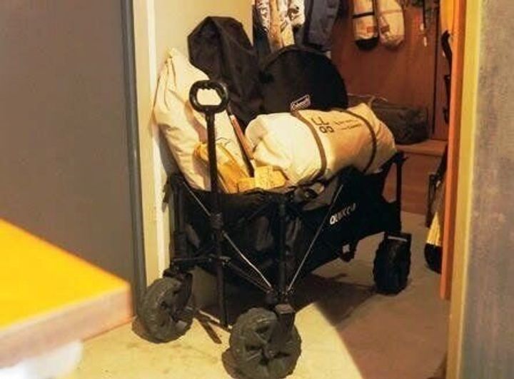 「キャンプグッズはしまいこまず、日頃から活用を!大物アイテムは、玄関などサッと出せる場所にまとめておきます」。