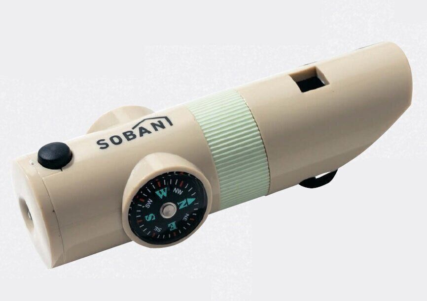 助けを呼ぶ際に必要なホイッスルをはじめ、方位磁石、ルーペ、ライト、小物入れ、ミラーの機能も!