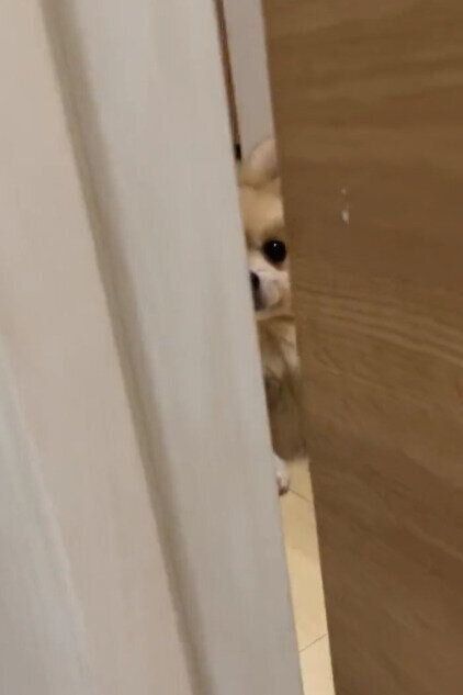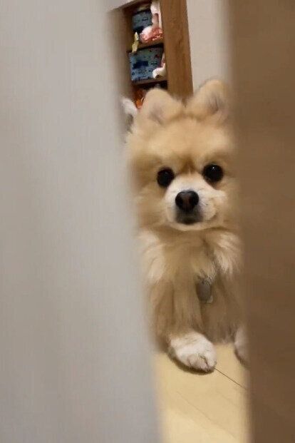 ポメラニアンのにんじゃさん(@motopii0331)がX(Twitter)に投稿したのはトイレまでついてくるかわいいストーカーについて。飼い主さんがドアの隙間から向こう側を覗くと、そこには愛犬・にんじゃくんが座っているようです。
