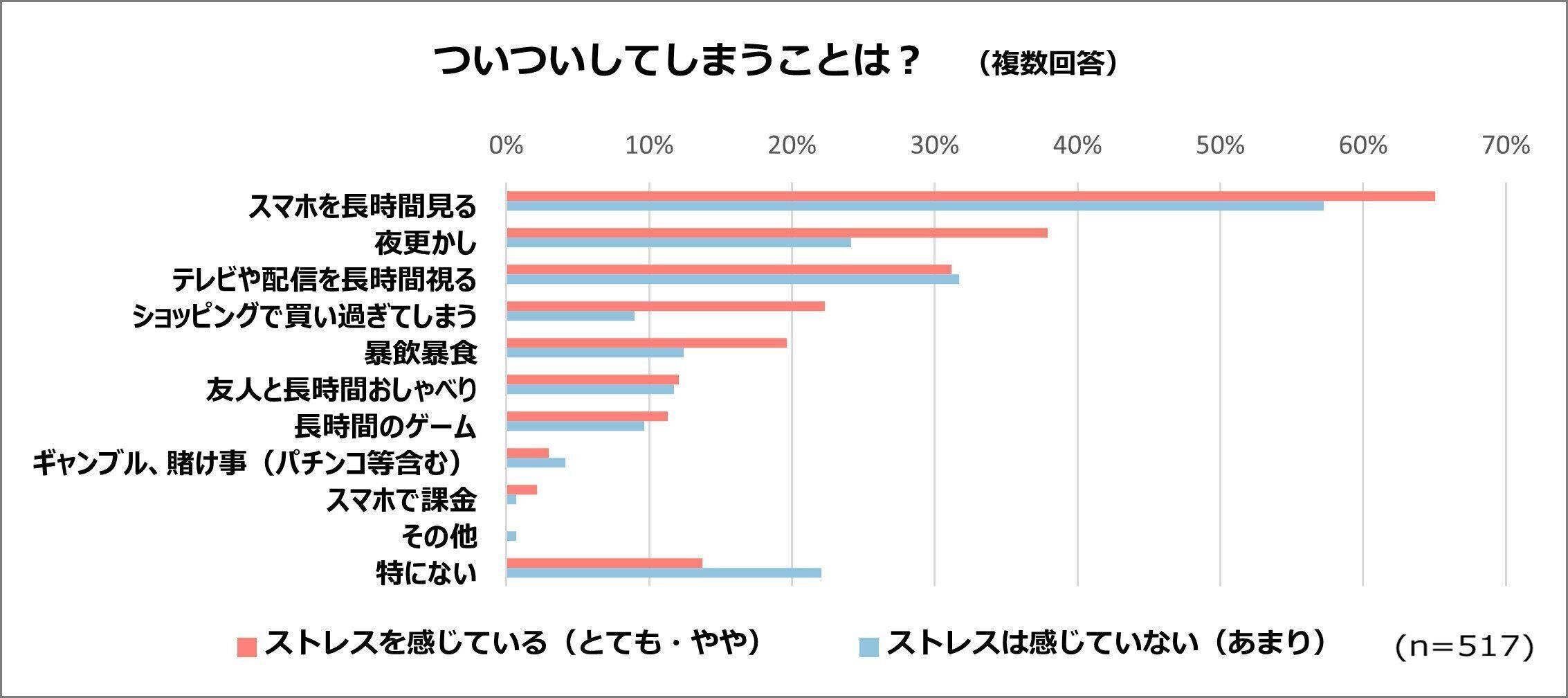 「夜更かし」「ショッピングで買い過ぎてしまう」「暴飲暴食」でも、ストレスを感じていない人との差がくっきり。ストレスを感じていない人は和菓子、洋菓子、チョコレート、ガムなどの嗜好品は、日常的に“摂取していない”こともわかっています。