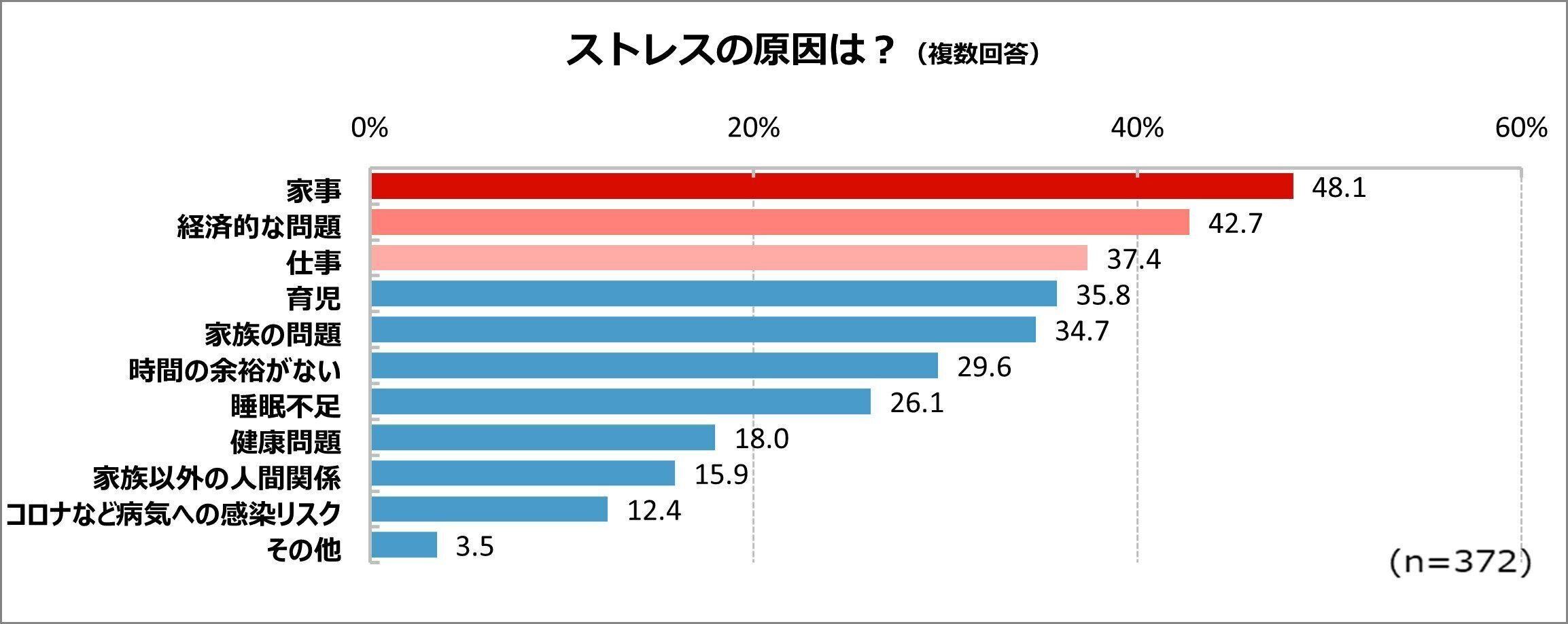 子どもの有無にかかわらず、ストレス要因の1位は家事でした。共働き夫婦が増えているものの、いまだに家事の負担は女性に偏っている現状が伺えます。