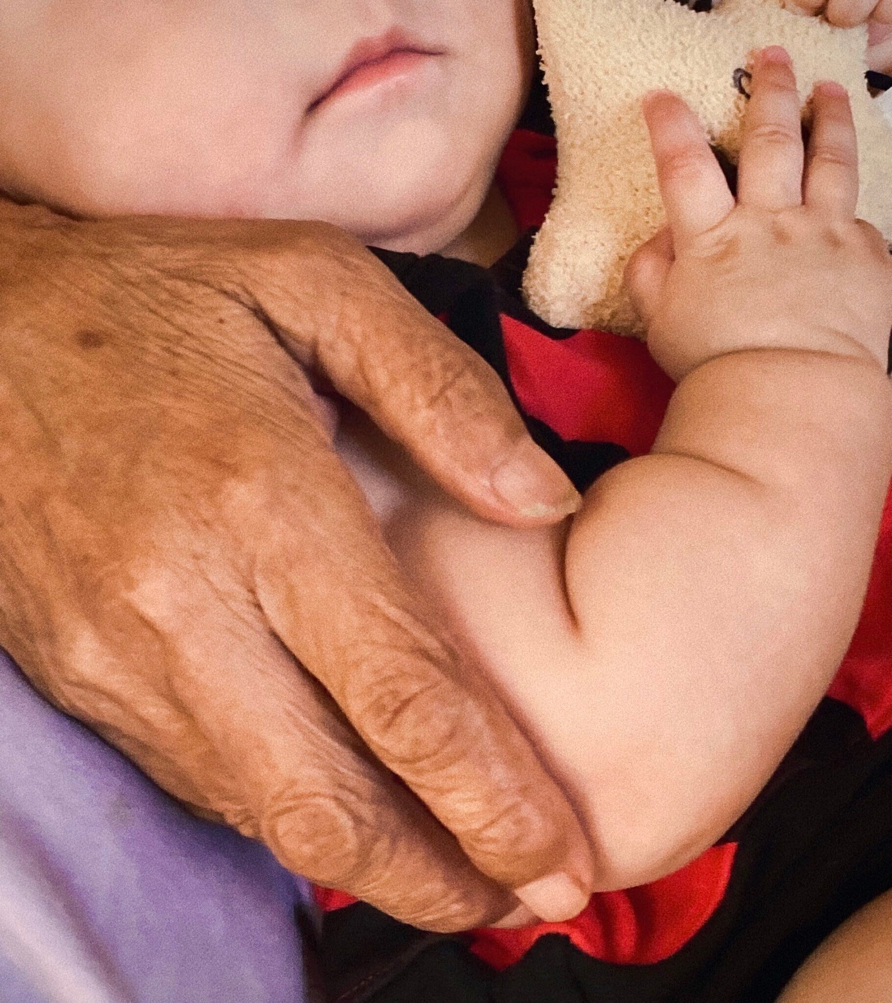 息子さんの小さな腕にそっと添えられたひいおばあちゃんの手には、これまでに経験してきたたくさんのできごとが刻まれているように感じられます。