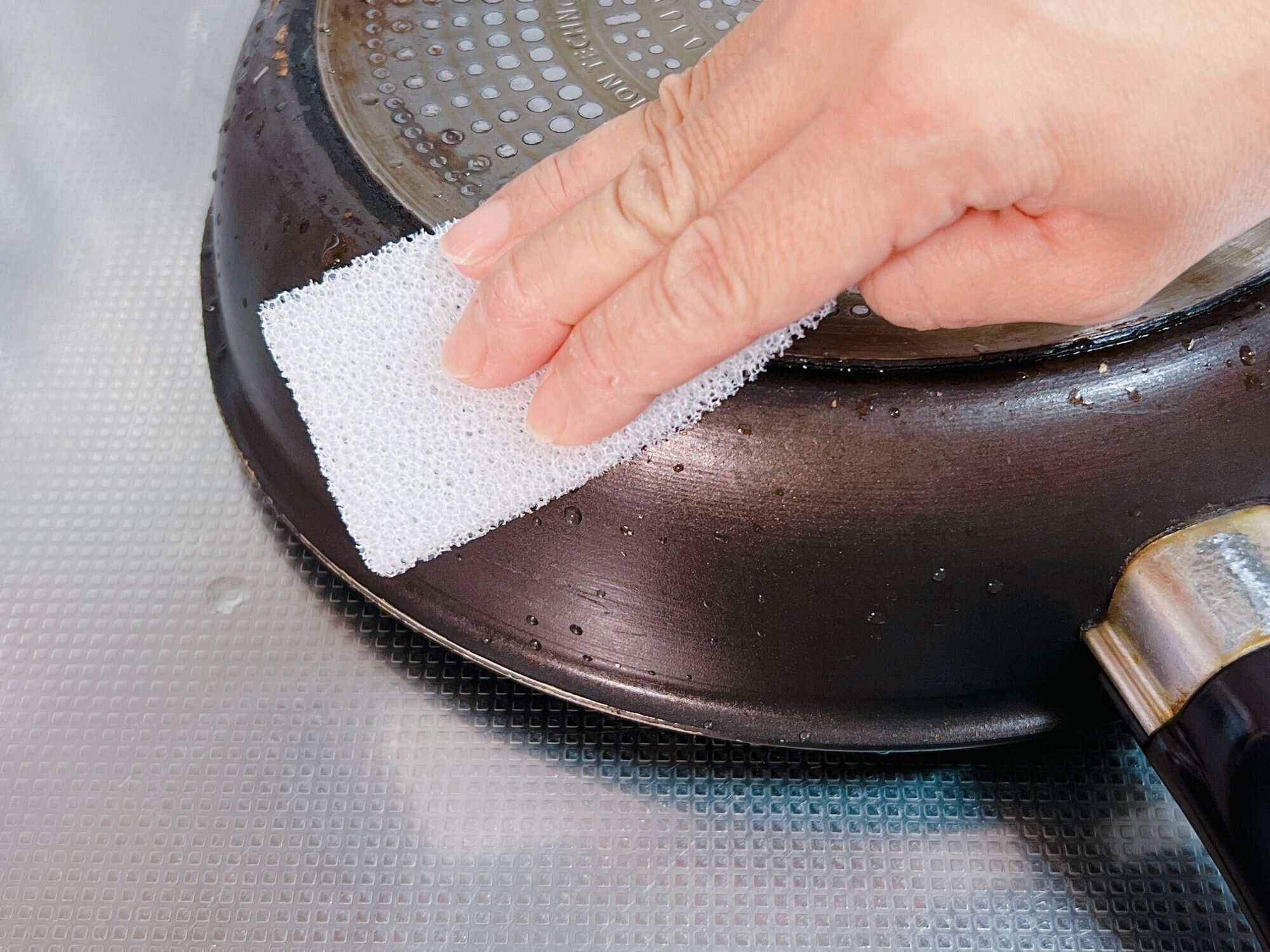 固めのスポンジなのでフライパンや鍋の底についた焦げなどを落とすのにピッタリです。